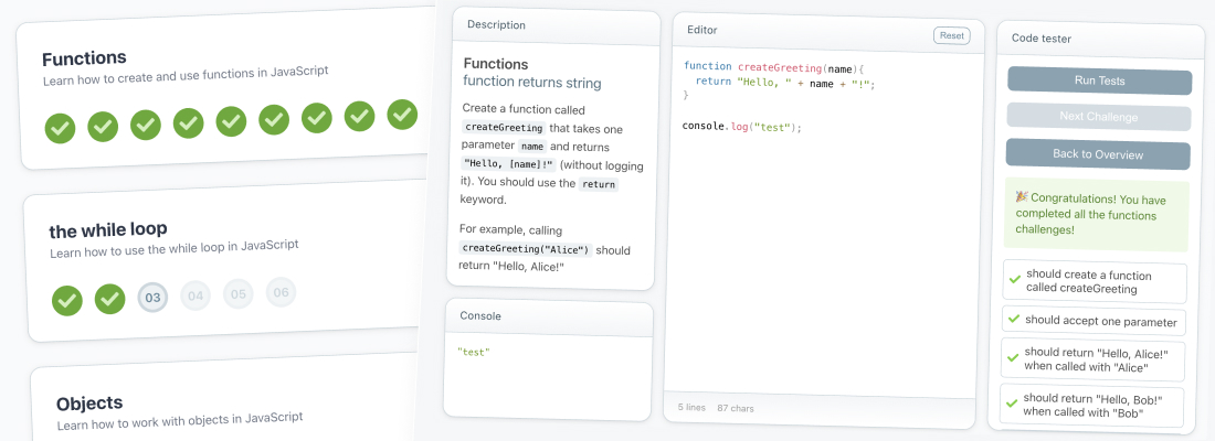 Coding challenges can be added and validated, making it easy to expand or adjust the course over time. Student code runs on the server in a secure, sandboxed environment, and test results are sent back to the client.